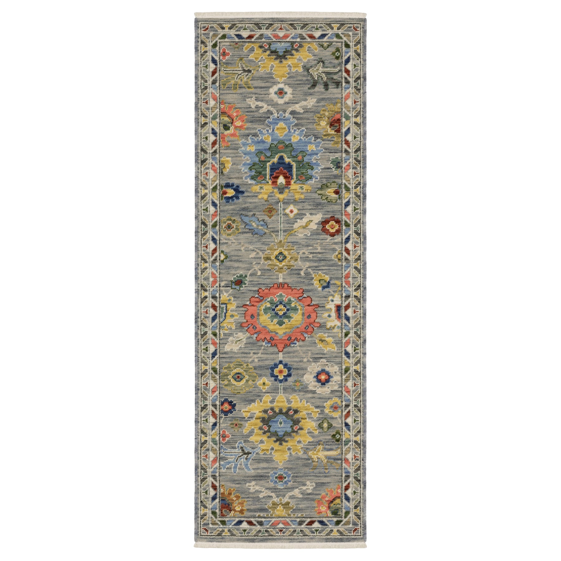 Rotate your rug often. Special care should be taken with the fringe when vacuuming, a vacuum can catch and pull the fringe. Spot clean with a solution of mild detergent and water and hang to dry if possible. Professional cleaning recommended periodically.