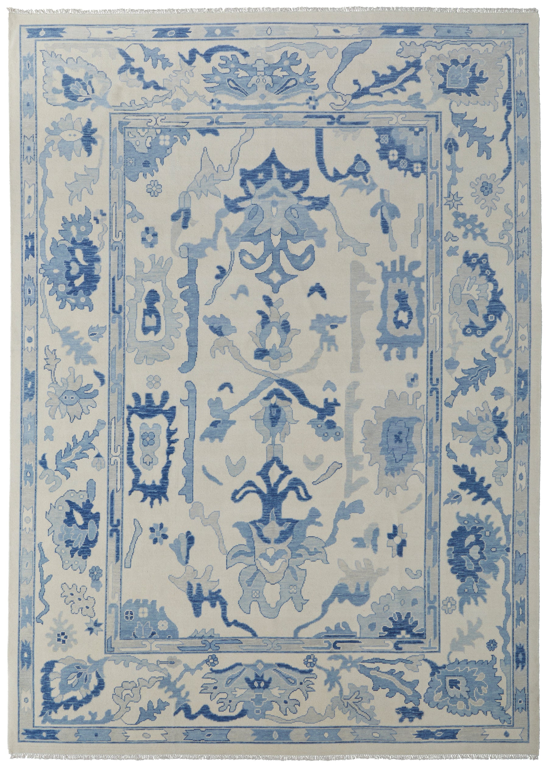 Rotate your rug often. Special care should be taken with the fringe when vacuuming, a vacuum can catch and pull the fringe. Spot clean with a solution of mild detergent and water and hang to dry if possible. Professional cleaning recommended periodically.
