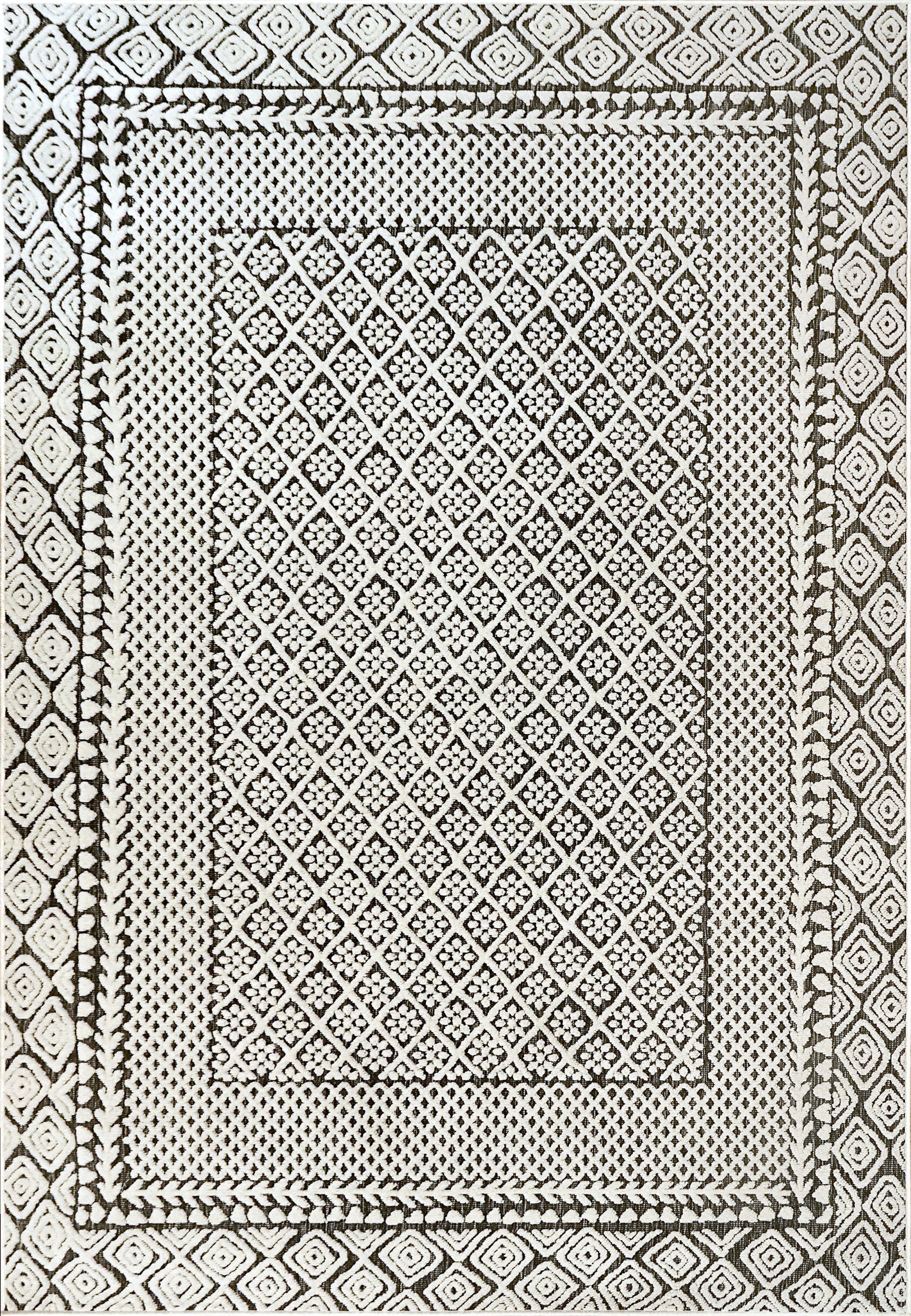 Lotus displays intricate contemporary designs that embolden any modern aesthetic. The detailed weaving in these rugs exists in three facets: the high-low texture, the changing yarn colors as a backdrop, and the designs. The color palette is more than meets the eye with these rugs, with ivory overlaying a more complex color scheme underneath, including black, blue, and multicolored yarns. Tightly woven and firm in their composure, these rugs are both durable and practical in their maintenance.