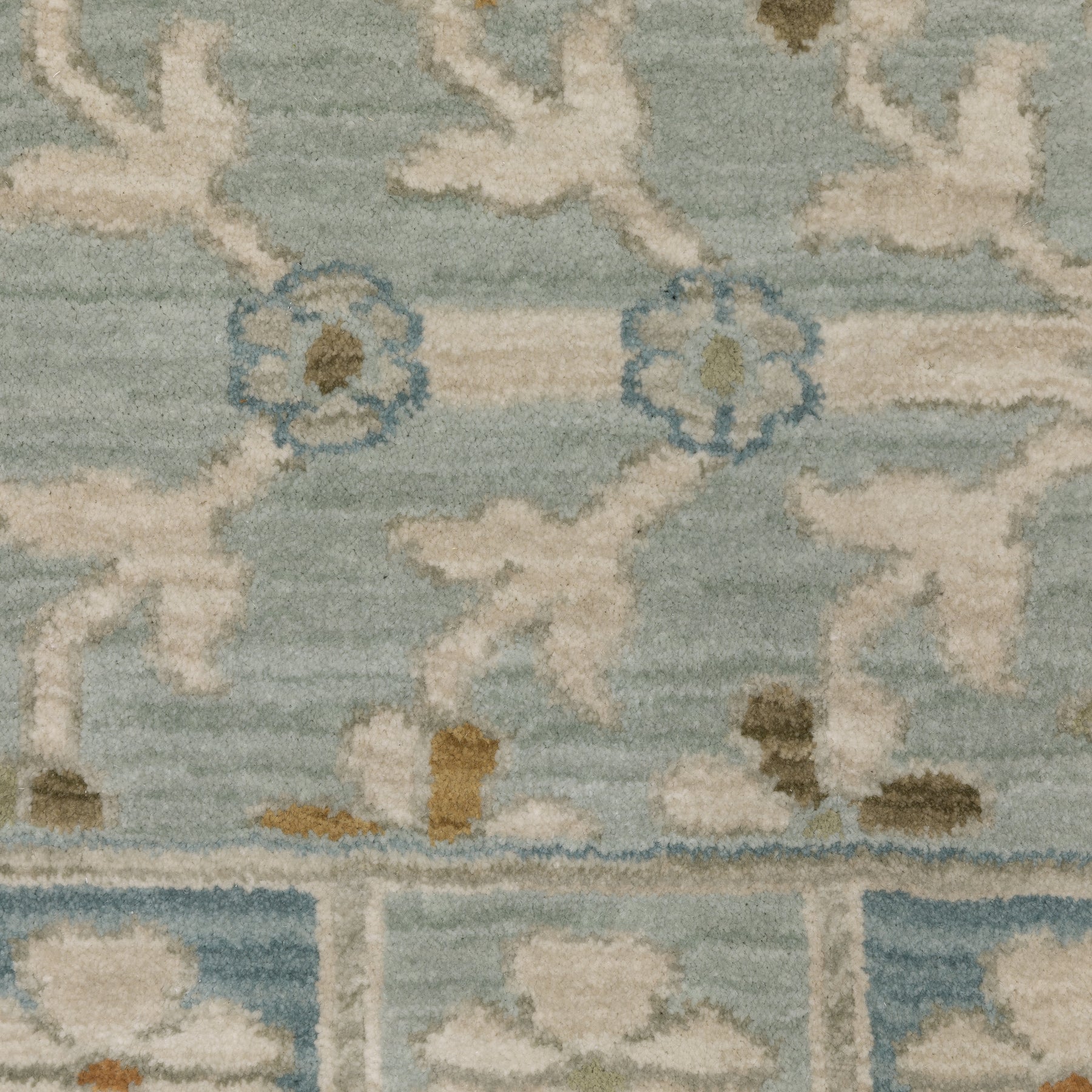 The Maeve collection features subtly pigmented color palette features neutral tones of ash brown, oat milk and sustained gray as well as mineral-based blues, matcha green, sunbaked clay and antique gold. The quietly modern color palette gives fresh appeal to traditional Persian and block print patterns with a touch of bohemian flair. It is power-loomed of super-soft, space-dyed polypropylene.